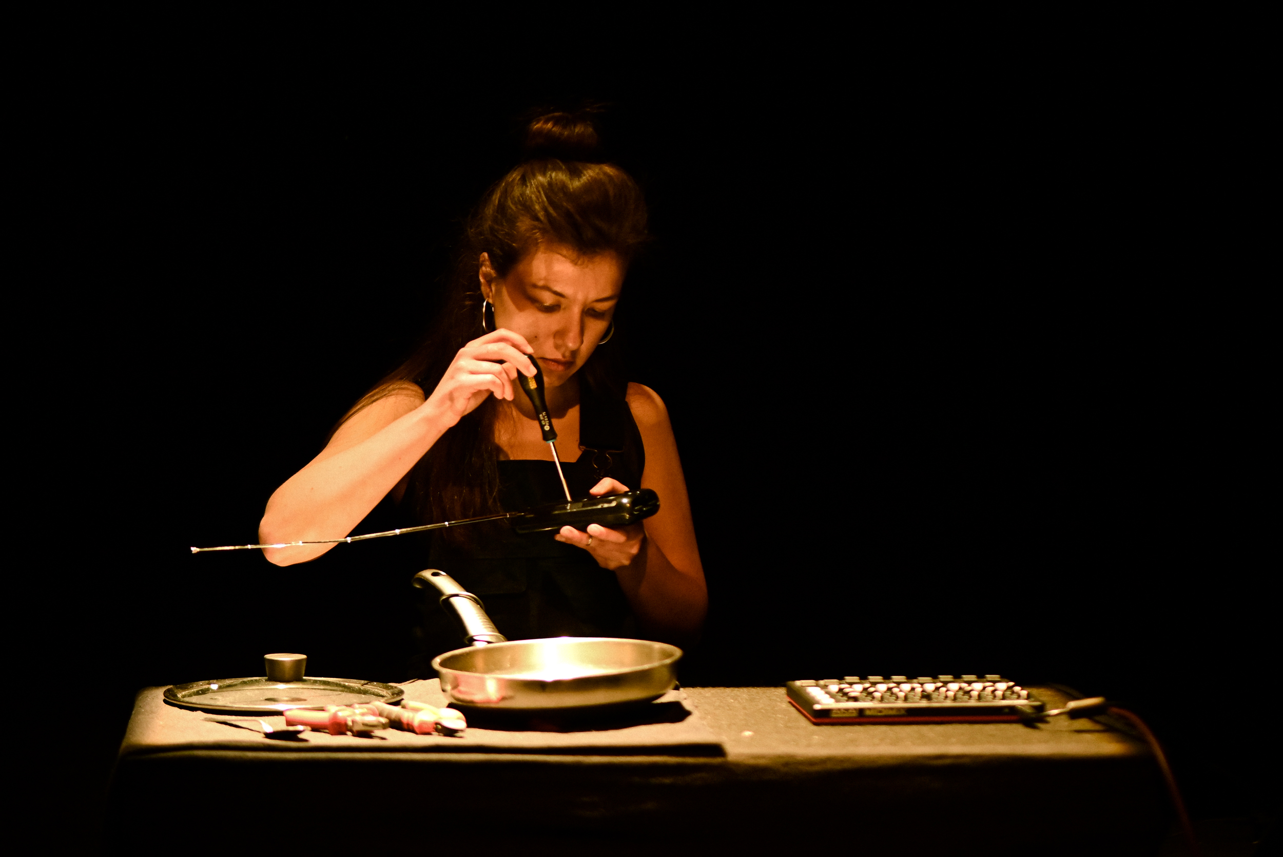MK: Ten jeden utwór zawiera… powiedziałabym, że trzy bardzo wyraźne linie w twojej muzyce. Pierwsza to użycie codziennych przedmiotów i zamienianie ich w instrumenty. Druga to elektryczność i kable (też w Pan Serenade), a także specyficzne brzmienia obiektów elektronicznych. I to buczenie, szum. Mam wrażenie, że słyszałam to buczenie w wielu twoich utworach. I oczywiście aspekt performatywny. Czy pracujesz raczej z elektroniką, czy z elektrycznością?